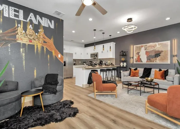 Dieses exquisite Feriendomizil bietet eine perfekte Ausgangsbasis für Reisende, die das lebendige Houston erkunden möchten. Mit seinen thematischen Akzenten und dem warmen Ambiente ist es ideal für Familien und Gruppen.